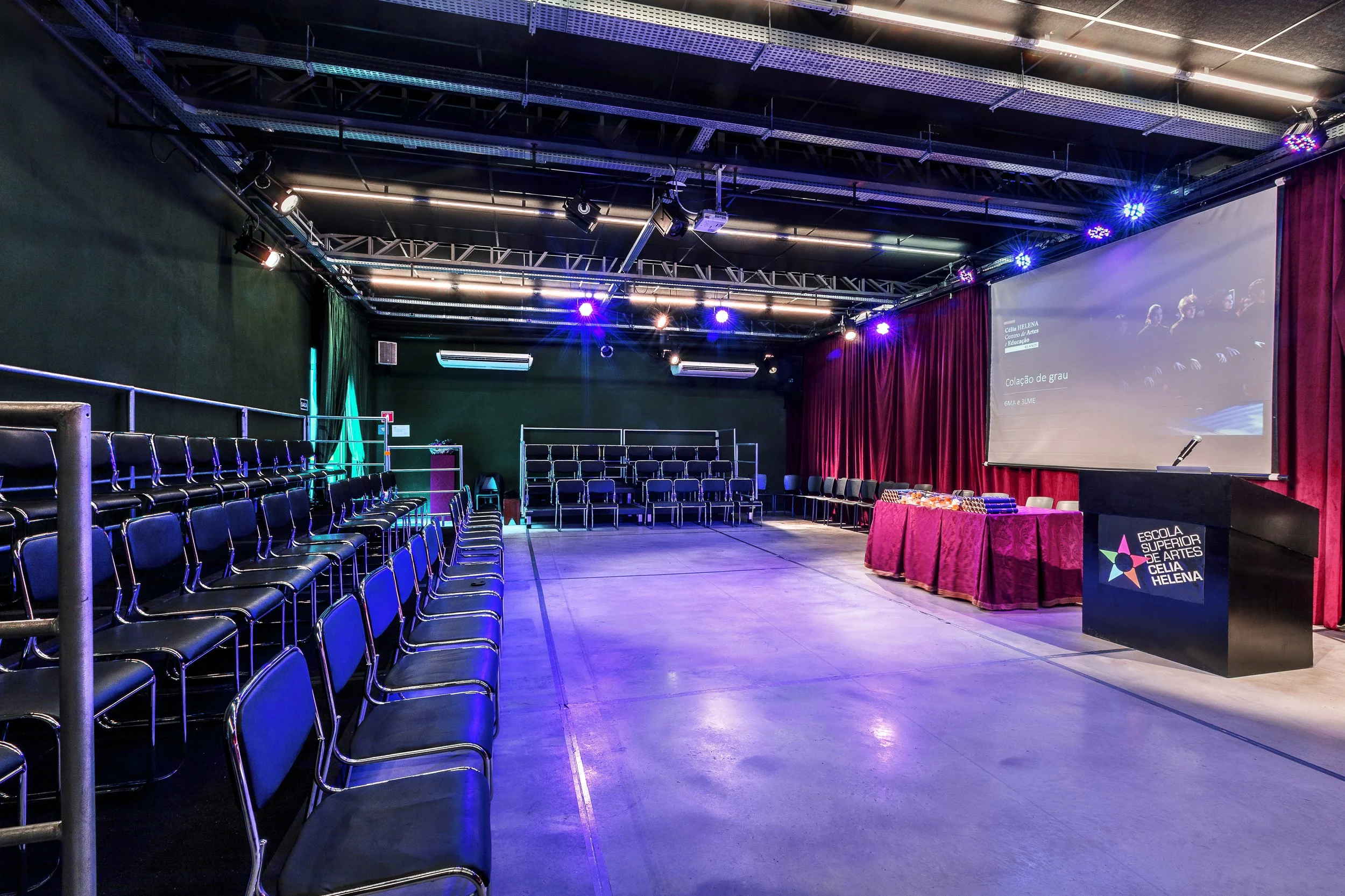 Equipado com recursos de multimídia, som e luz, está localizado no bairro do Itaim Bibi, em São Paulo, e é utilizado para aulas, ensaios, apresentações de processos criativos, seminários, eventos e trabalhos experimentais dos alunos.
